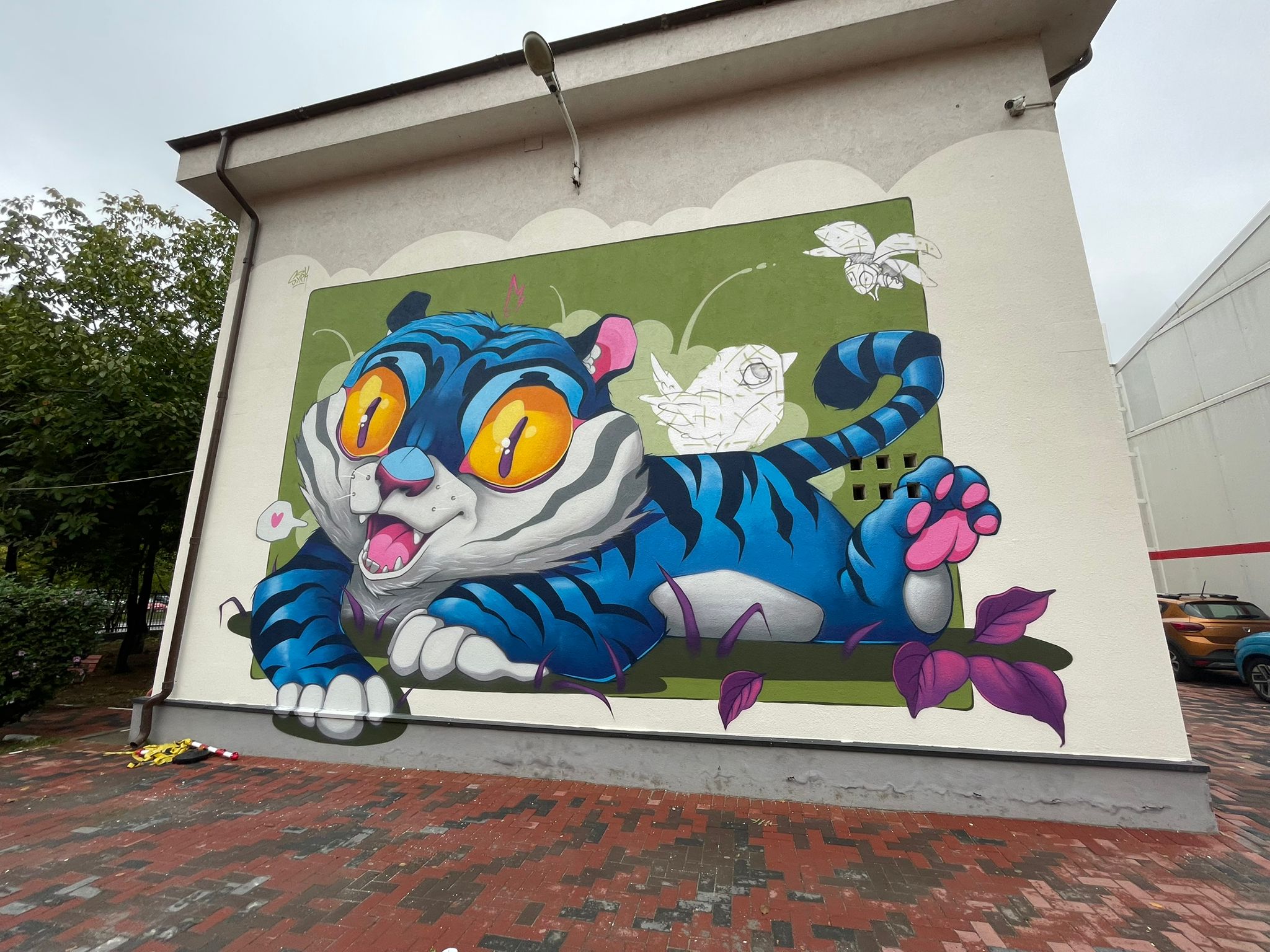 Pe unul dintre pereții școlii, un tigru albastru cu ochi galbeni pare că a prins viață chiar sub pensula artiștilor, iar pe o altă fațadă, o casă stilizată amintește de desenele din caietele de colorat.