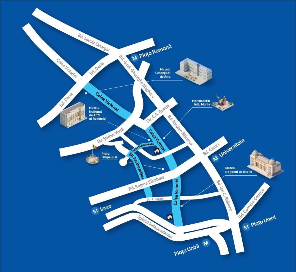 - Calea Victoriei – pe segmentul de drum cuprins între Bd. Dacia – Splaiul Independenței;