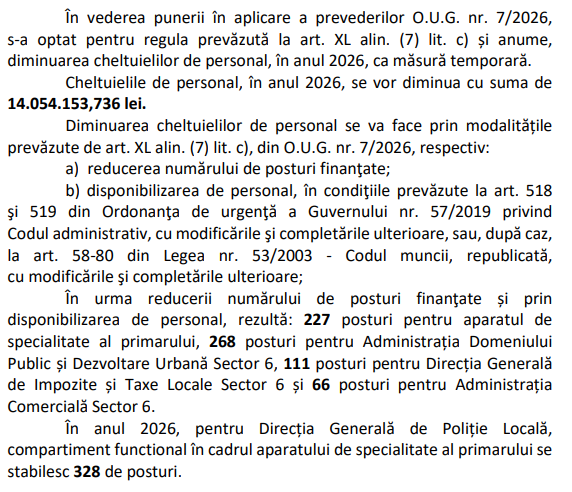 „Pentru respectarea termenului de implementare, respectiv 1 iulie 2026, instituțiile publice sus-menționate și aparatul de specialitate al primarului vor supune aprobării Consiliului Local al Sectorului 6, structura organizatorică, statul de funcții și Regulamentul de Organizare și Funcționare, în termen de 30 de zile de la data aprobării hotărârii Consiliului Local al Sectorului 6 privind diminuarea cheltuielilor de personal, în anul 2026, pentru punerea în aplicare a prevederilor Ordonanței de urgență a Guvernului nr. 7/2026.”, se mai precizează în documentația proiectului.