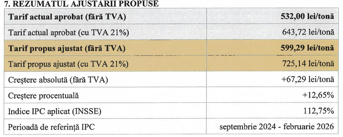 Raportul de specialitate precizează și că modificare tarifelor nu va produce modificări în ceea ce privește durata acordului cadru sau cantitățile minime/maxime de deșeuri estimate.