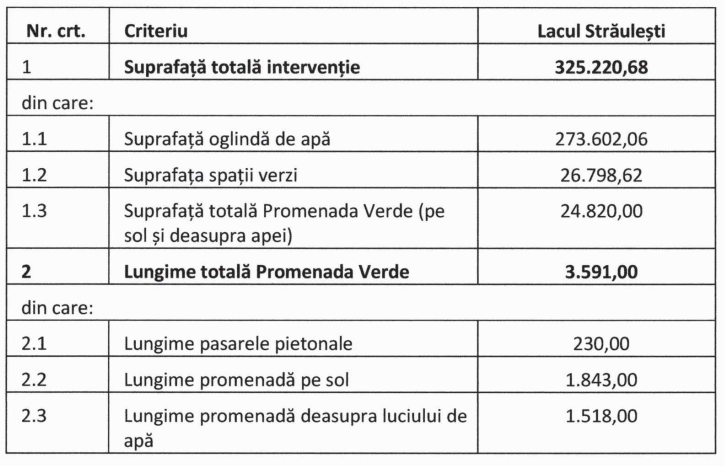Proiectul privind amenajarea malurilor lacului Străulești vizează o suprafață totală de intervenție de peste 320.000 de metri pătrați, cu un tronson de promenadă de circa 3,6 kilometri. Costurile estimate se ridică la aproape 144 milioane lei.