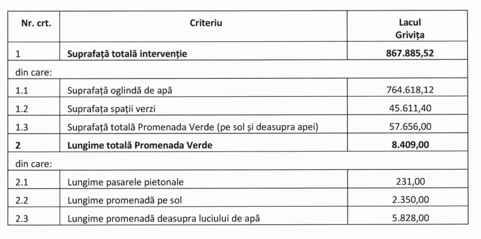 Cel mai scump proiect vizează malurile lacului Grivița, unde se va amenaja și cel mai lung tronson de promenadă, de circa 8,5 kilometri. Suprafața totală de intervenție este de peste 860.000 de metri pătraţi, iar valoarea totală a lucrărilor se ridică la mai bine de 483 milioane de lei.