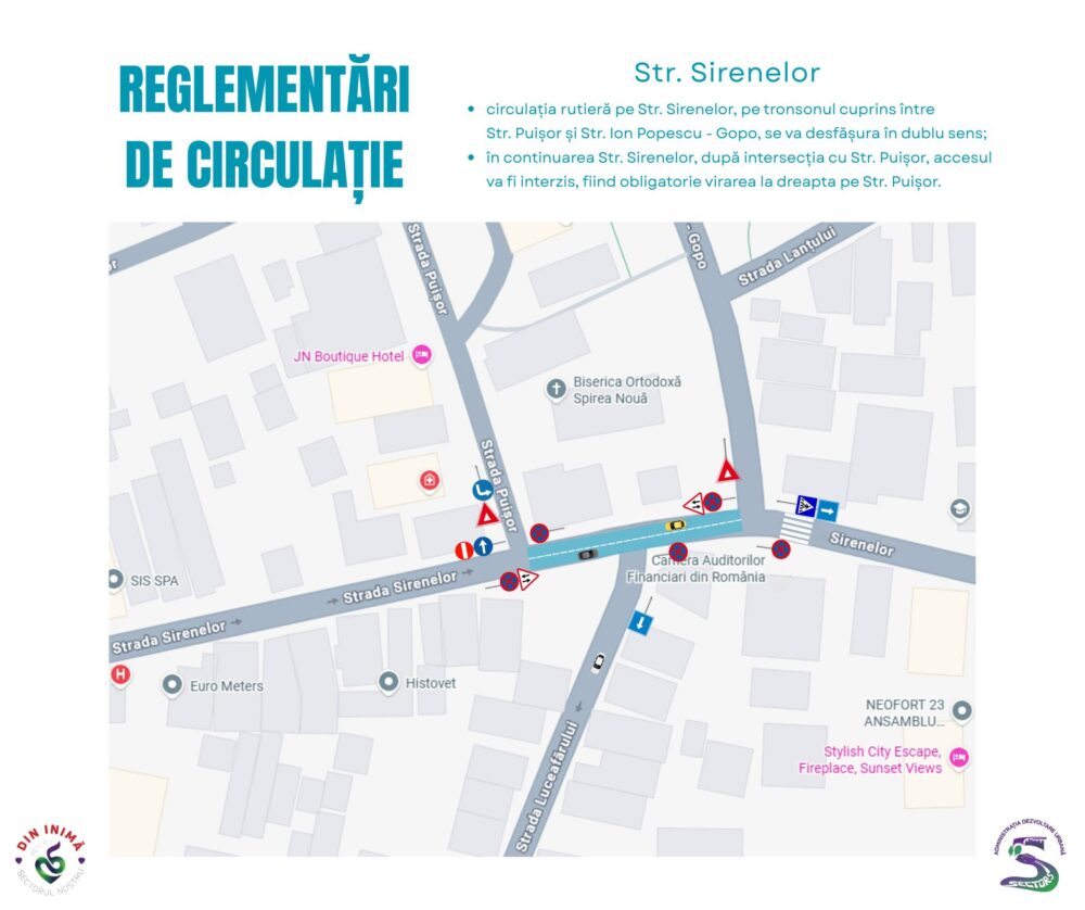 „Administrația Dezvoltare Urbană Sector 5 vă informează că, în urma proiectului de sistematizare rutieră, circulația pe Str. Sirenelor, pe tronsonul cuprins între Str. Puișor și Str. Ion Popescu – Gopo, se va desfășura în dublu sens.