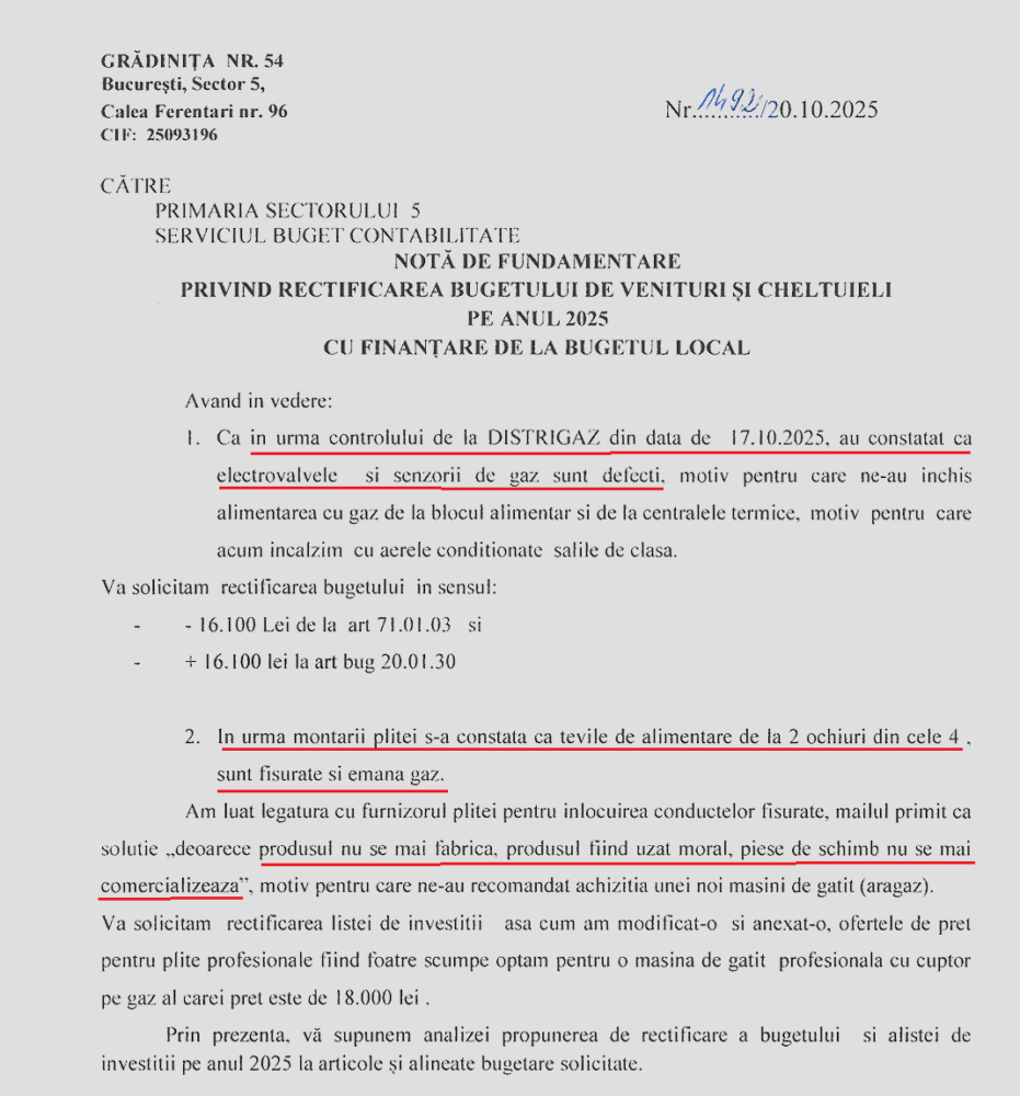 Documentele arată că pentru remedierea defecțiunilor la sistemul de gaze, inclusiv înlocuirea senzorilor și a electrovalvelor, unitatea de învățământ a solicitat 16.100 de lei și alți 18.000 de lei pentru o mașină de gătit „mai puțin scumpă”. Suma solicitată ar urma să fie realocată din fondurile destinate investițiilor.