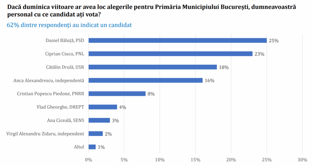 Potrivit sondajului Avangarde, pe primul loc se clasează primarul social-democrat al Sectorului 4, Daniel Băluță. Acesta este urmat îndeaproape de liberalul Ciprian Ciucu, edilul Sectorului 6, cotat la 23%. Locul al treilea este ocupat de deputatul Cătălin Drulă (USR), cu 18% din intențiile de vot.
