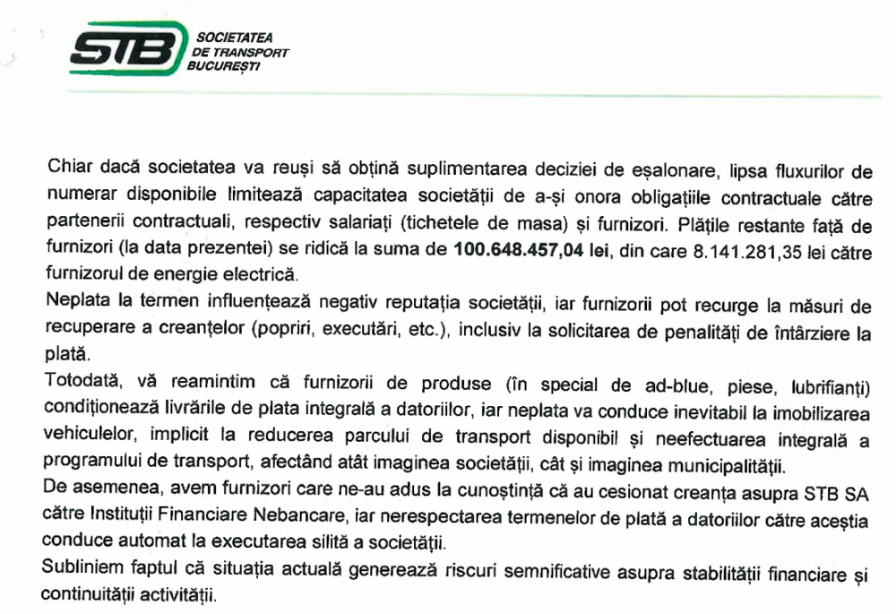 Societatea de Transport București (STB) este în pragul colapsului, aflându-se într-un blocaj financiar total la începutul anului 2026. Un document intern, semnat de directorul general Andrei Dinculescu-Bighea și adresat primarului general Ciprian Ciucu, descrie o situație critică.