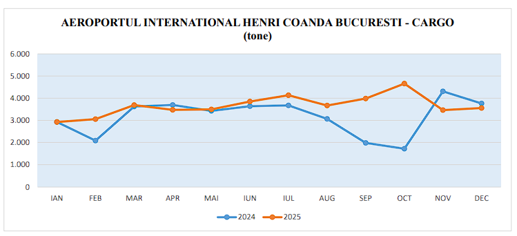 Aeroportul a procesat doar 3.461 de tone de marfă, comparativ cu 4.309 tone în noiembrie 2024. Trendul descendent a continuat și în luna decembrie, cu o scădere de 5,5%, cu un volum de 3.556 de tone, față de 3.765 de tone în 2024.