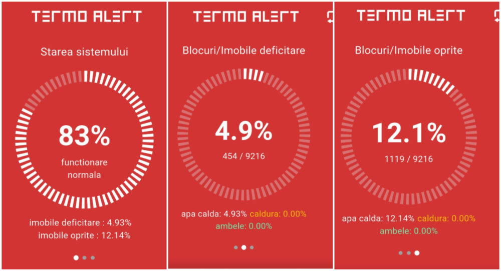 Potrivit aplicației Termoalert, sistemul de termoficare funcționează la capacitate de 83%. Cele mai multe probleme sunt în Sectoarele 3 și 4, unde apa caldă este fie oprită, fie funcționează deficitar.