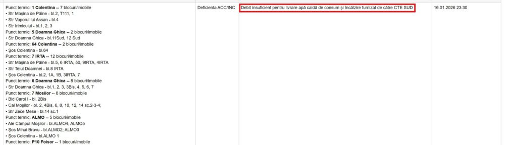 Datele privind starea sistemului de termoficare arată o situație critică „palpabilă” nu doar în apartamente, ci și în tabelele tehnice. Mii de imobile din Capitală figurează, în premieră, cu sincope în alimentarea cu agent termic nu din cauza unor avarii „tradiționale”, ci sub eticheta „debit insuficient pentru livrare apă caldă și încălzire” pe magistralele CET Sud.