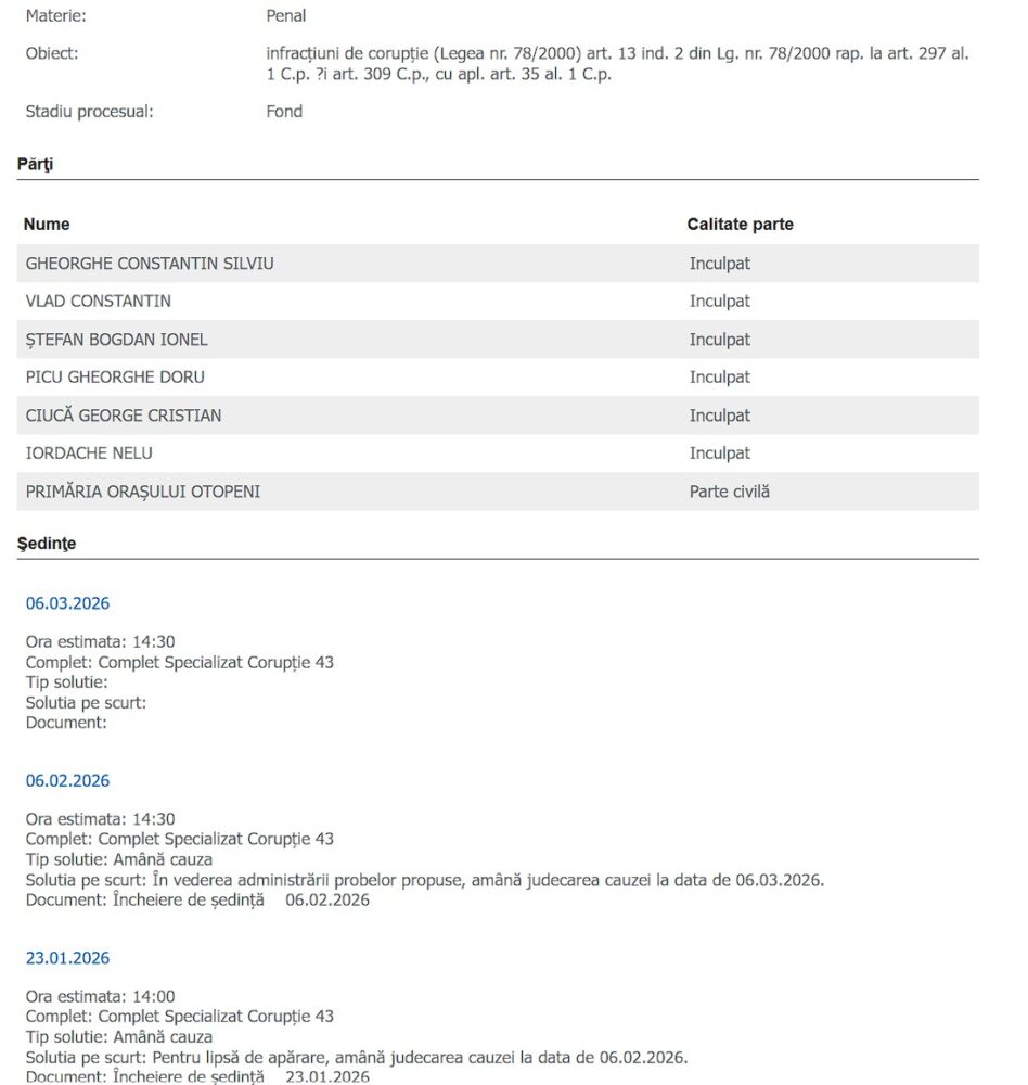 Datele oficiale de pe portalul instanțelor arată un parcurs sinuos al dosarului. După ce Buletin de București a aratat că la termenul din 23 ianuarie 2026, când cauza a fost amânată a treia oară pentru „lipsă de apărare”, magistrații au considerat oportună necesitatea administrării probelor și au stabilit următorul termen pentru data de 6 martie 2026, la ora 14:30.