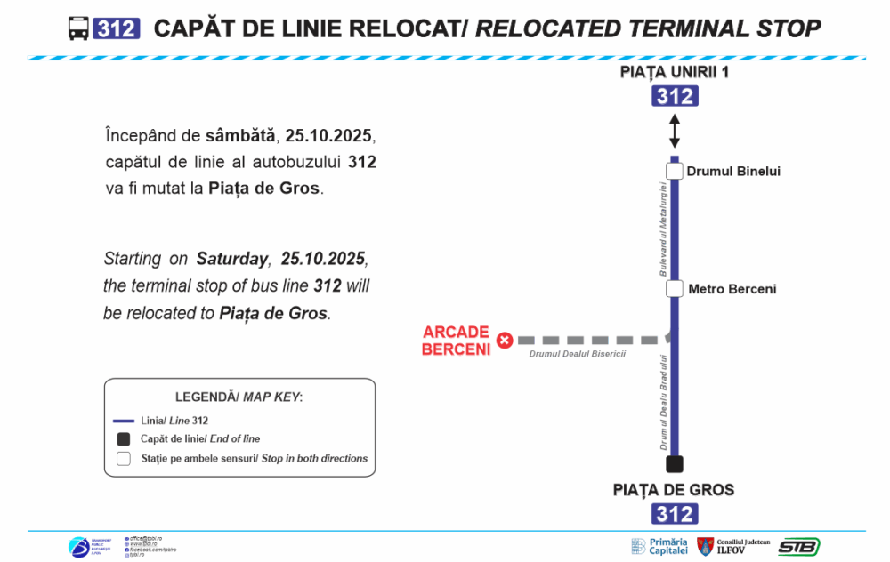 Începând de sâmbătă, 25.10.2025, autobuzele liniei 312 vor întoarce la „Piața de Gros”, în loc de „Arcade Berceni”, ca până acum. Asociația de Dezvoltare Intercomunitară pentru Transport Public București – Ilfov (TPBI) a dispus această măsură pentru asigurarea unei conexiuni între linia 312 și linia de troleibuz 73.