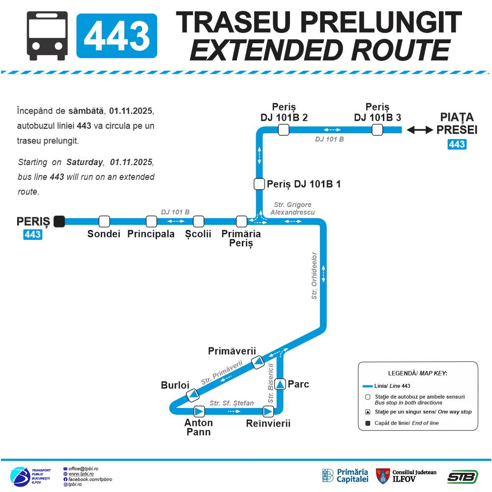 De sâmbătă, 1 noiembrie 2025, linia 443 va avea un traseu prelungit în mai multe zone din comuna Periș, a anunțat Asociația de Dezvoltare Intercomunitară (TPBI).
