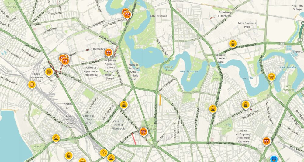 Hărțile Waze indică totuși prezența a numeroase lucrări edilitare și obstacole pe carosabil, semnalizate de utilizatori.