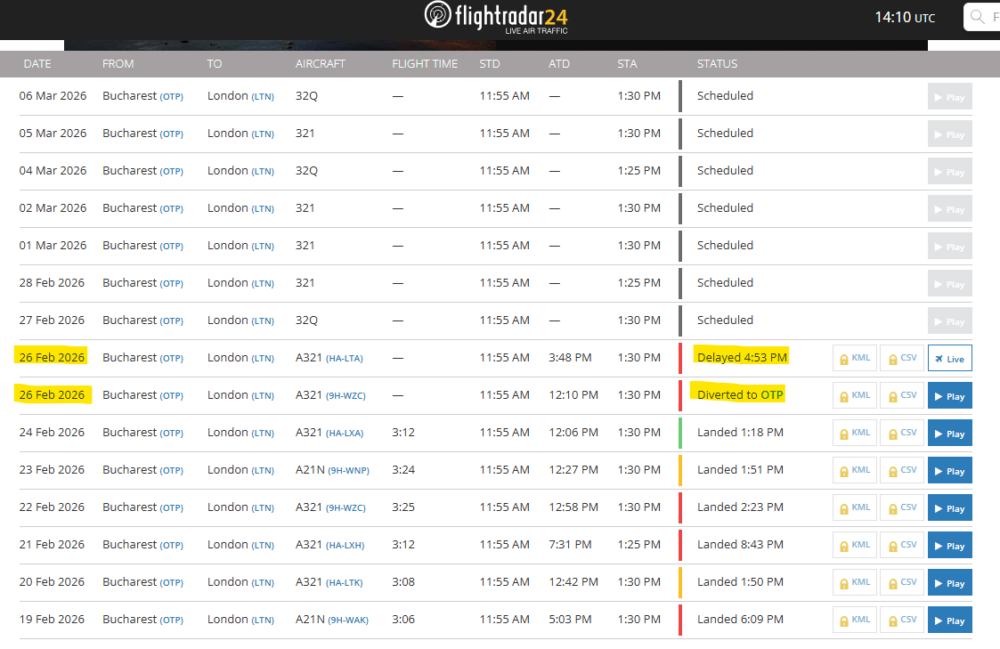 Zborul W43005 București Otopeni – Londra Luton a avut întârzieri de două ori, în ultima săptămână. Pe 19 februarie, avionul a decolat la ora 17:03, loc de 11:55.