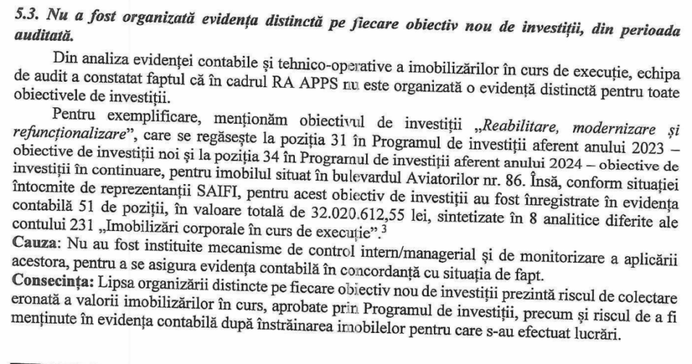 Comisarii Curții de Conturi semnalează că RA-APPPS nu a ținut o evidență clară a cheltuielilor, separată pentru fiecare investiție în parte, ceea ce face urmărirea banilor mai dificilă şi creşte riscul raportării greşite, după cum a explicat experta contabilă Laura Ştir, pentru Buletin de Bucureşti.