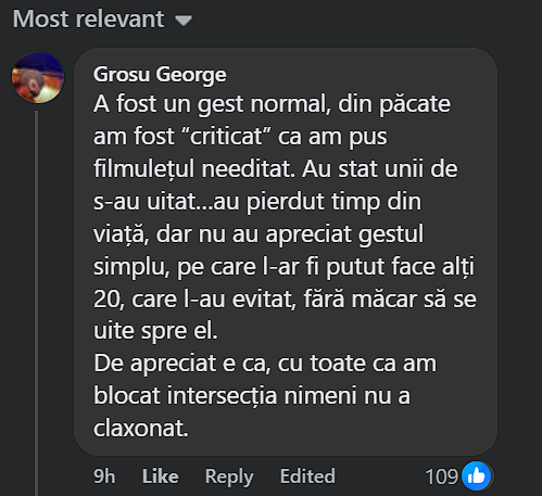 Înregistrarea audio din habitaclu, postata pe grupul INFO TRAFIC ROMANIA, captează o reacție de revoltă a șoferului, în timp ce postarea a generat un val de comentarii negative la adresa celor care au asistat nepăsători.