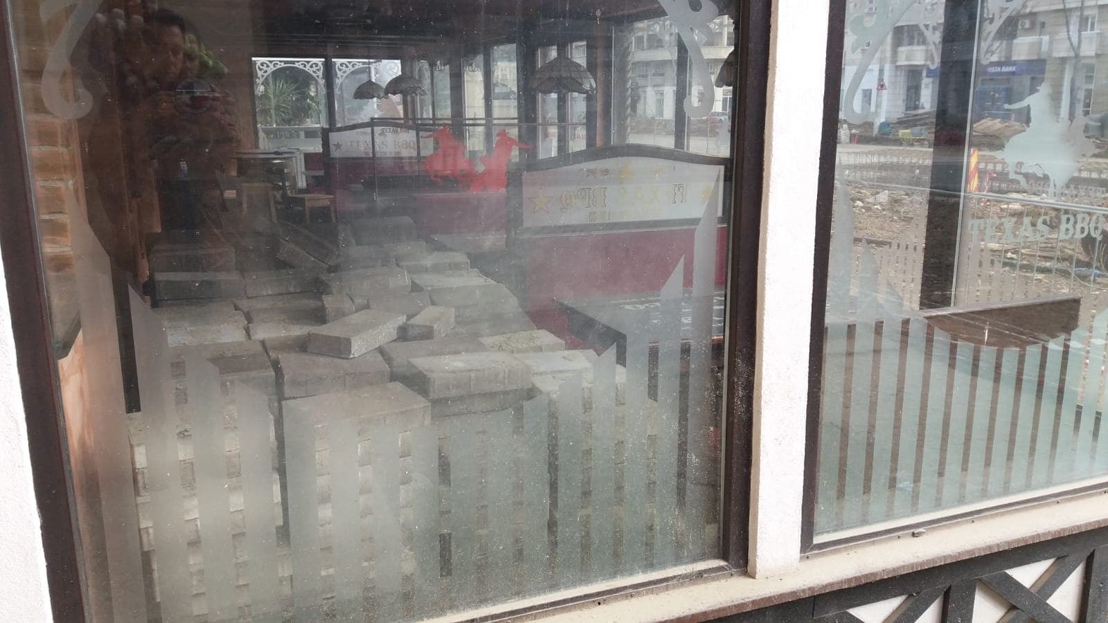 Prin ferestrele pline de zoaie, se vad mesele prăfuite şi mobilierul depozitat la întâmplare. Pentru a-şi mai limita paguba, unul dintre patroni şi-a adunat dalele de piatră pe care le montase în faţă şi le-a depozitat chiar în restaurant.